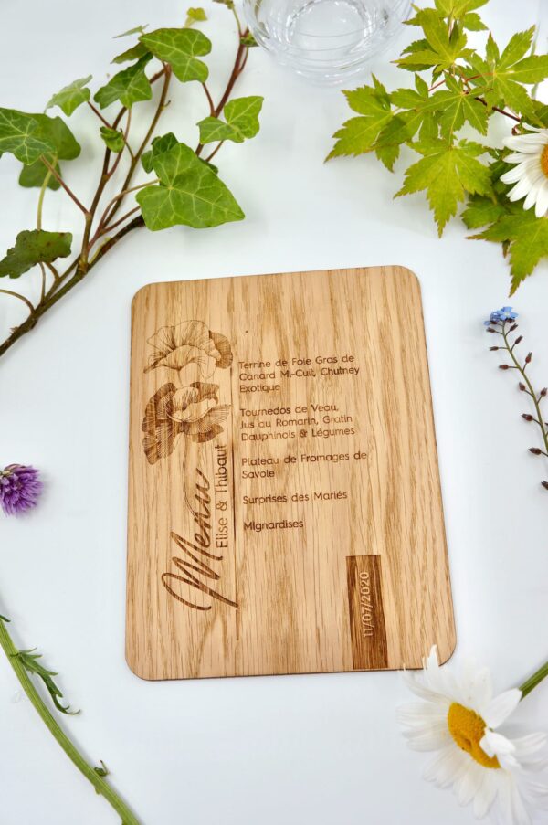 Et bien nous aussi, nous avons été inspiré par cette fleur et nous vous proposons donc ce menu en bois. Ce menu mariage thème coquelicot arbore une fine gravure de fleurs et d’élégante typographie. Le tout composé avec simplicité et passion. Son design sobre s’associera facilement avec le rouge de vos compositions florales.