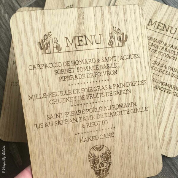 Ce menu en bois personnalisé sur le thème de « los dias de los muertos » va épater vos convives.